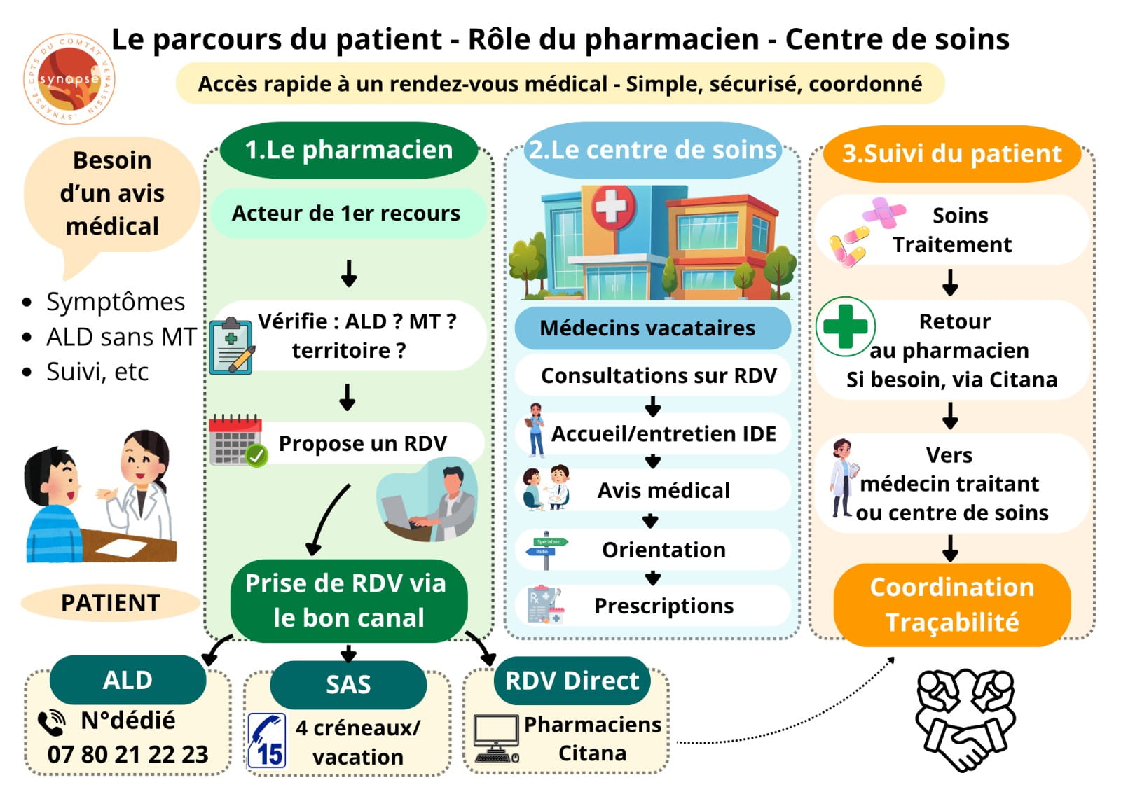 Sur le territoire de la CPTS Synapse, comme dans de nombreuses zones en France, un nombre grandissant de patients se retrouvent sans médecin traitant. Face aux sollicitations répétées qu’ils reçoivent au quotidien, les pharmaciens constituent souvent le premier, et parfois le seul point de contact de ces patients avec le système de santé.
